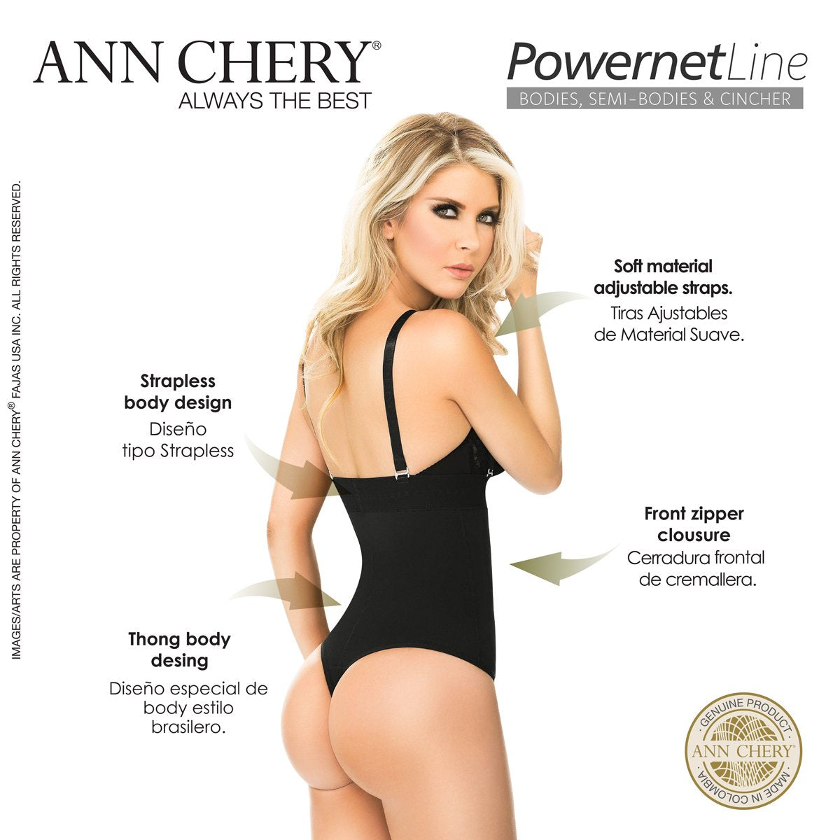 Butt lifting bodysuit with strapless design, side zipper with internal hook and eye closure system, adjustable and removable straps, provides lower, medium and upper abdominal control.